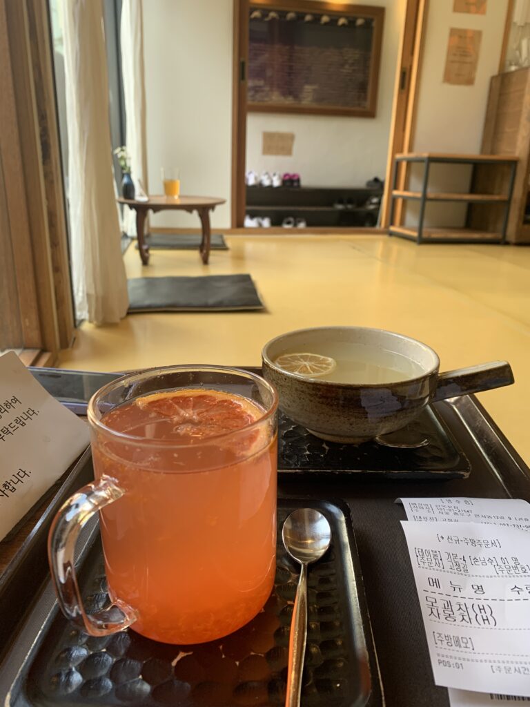 The tea menu at the Hanok tea house offers a variety of traditional Korean teas, each with its own unique flavor profile. During our visit, we tried two popular teas: grapefruit tea and “Quince tea.”